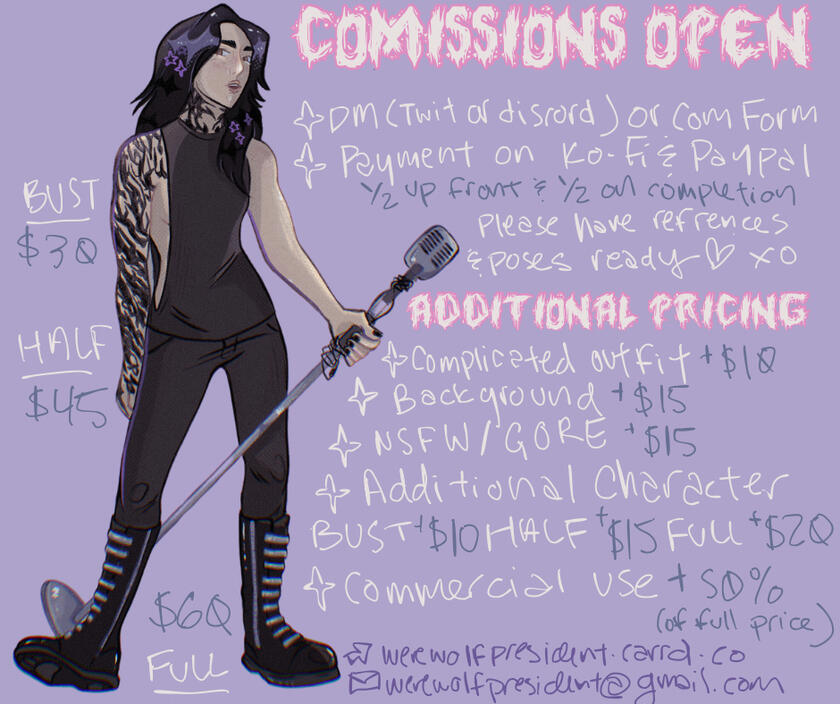 ✦ Bust +$10 ✦ Half +$15 ✦ Full +$20Messages can be sent through social media (@werewolfeprez on twitter) or discord (werewolf president) or through the contact form below.Please have references ready to send, the more info the better!